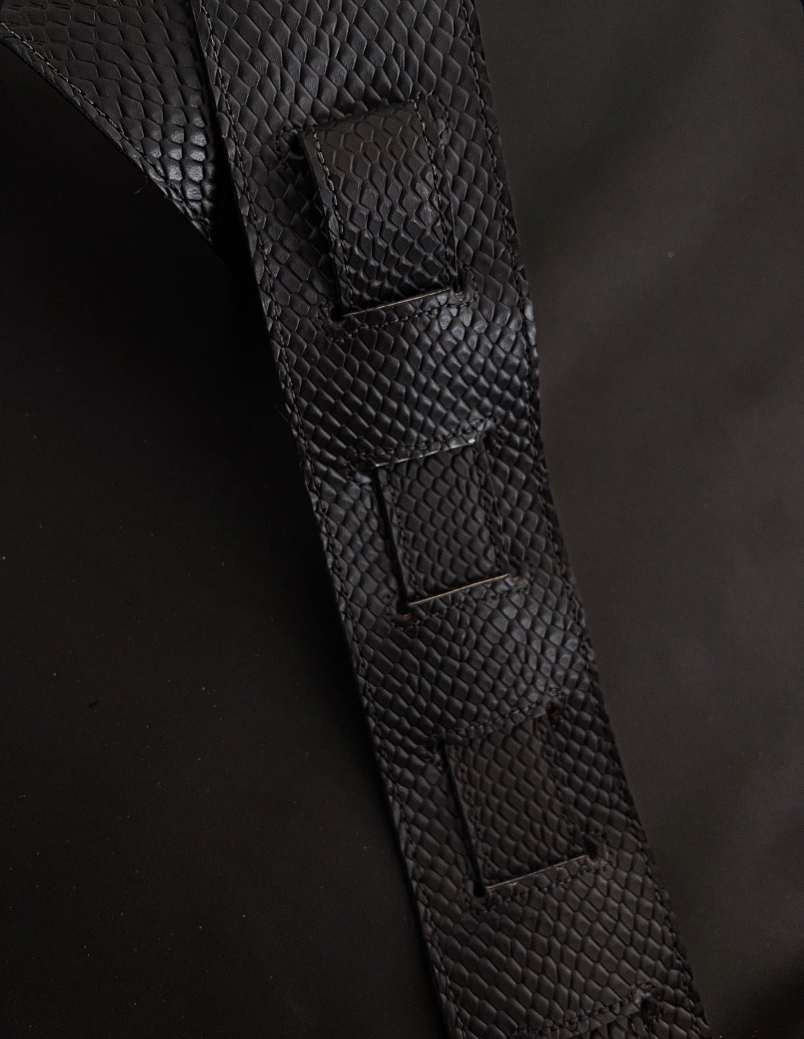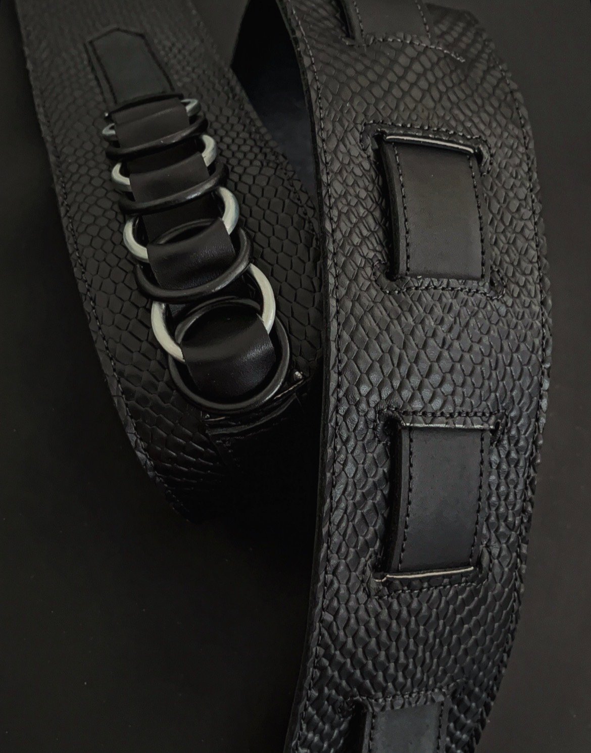→Los orificios de cada extremo y ranuras desde donde regulas el largo de la correa, están cosidos por todos sus bordes para soportar perfectamente el peso de tu instrumento a través de los años!