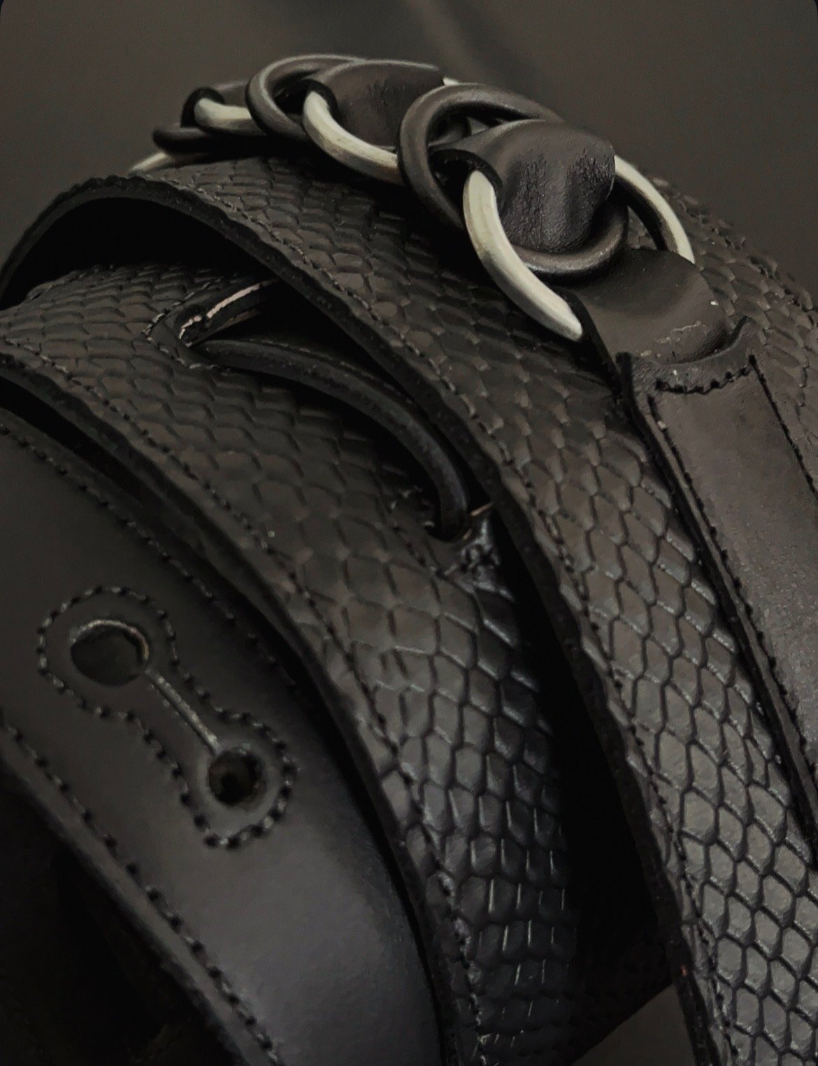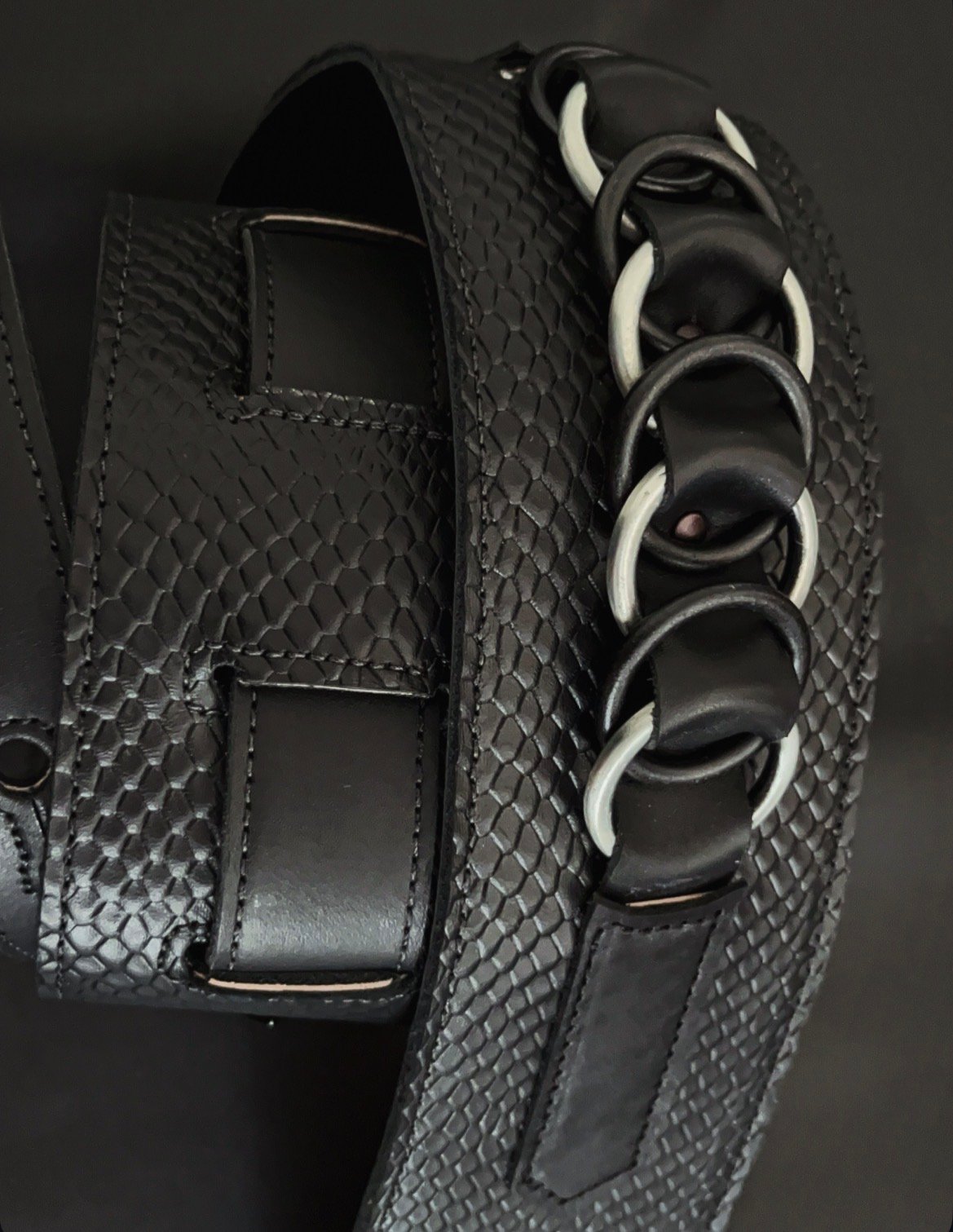 Una correa sumamente original que no encontrarás en ningún otro lugar. Con detalles de argollas y cueros misturados que agregan un toque único, esta correa está confeccionada con cueros exclusivos que le otorgan un estilo inigualable.