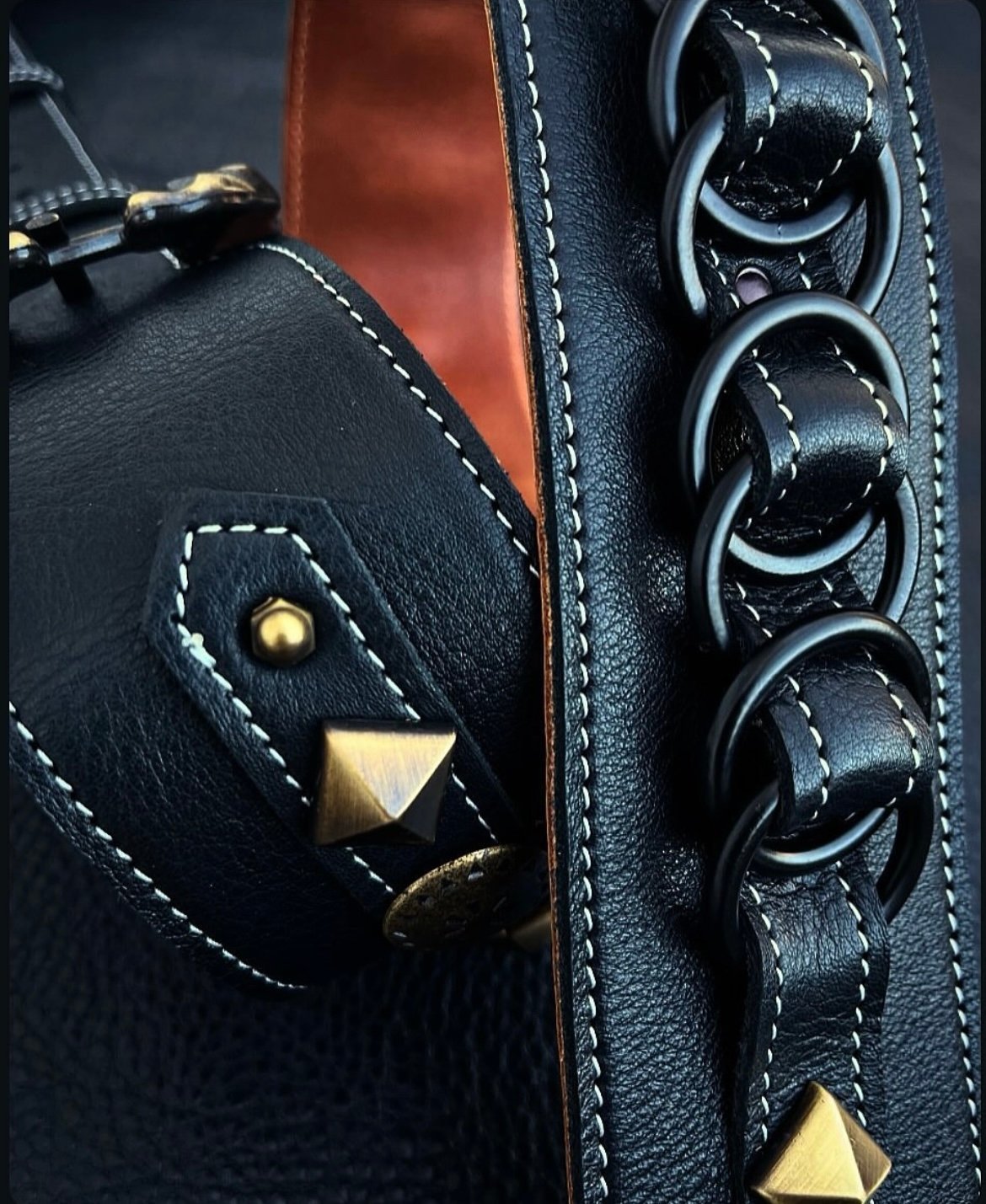 Una correa tan rockera como sofisticada. Hecha con materiales de altísima calidad. Incluye un accesorio infaltable para todos los amantes de la generación de los 90’s como son las bandanas! y detalles de conchos metálicos combinados con muy buen gusto!