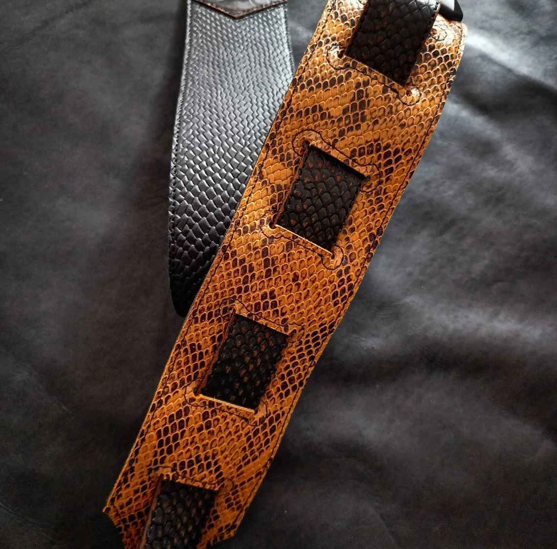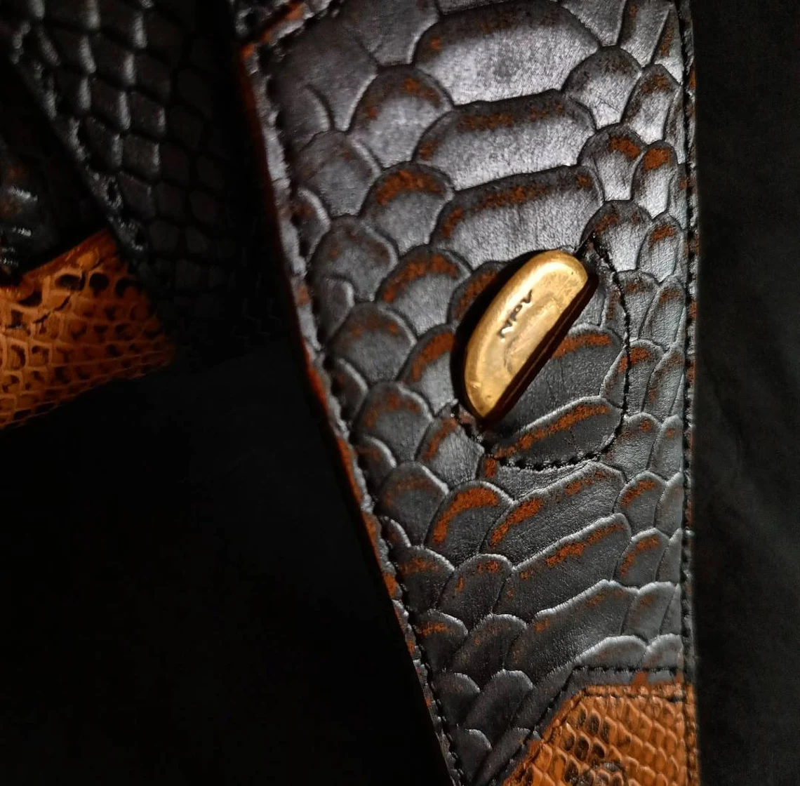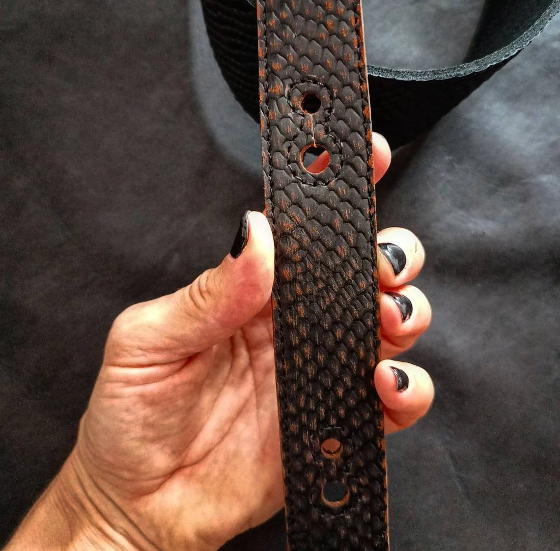 Custom Leather DesignsUna original combinacion de cueros que dan por resultado, una correa única!. Sumamente flexible!