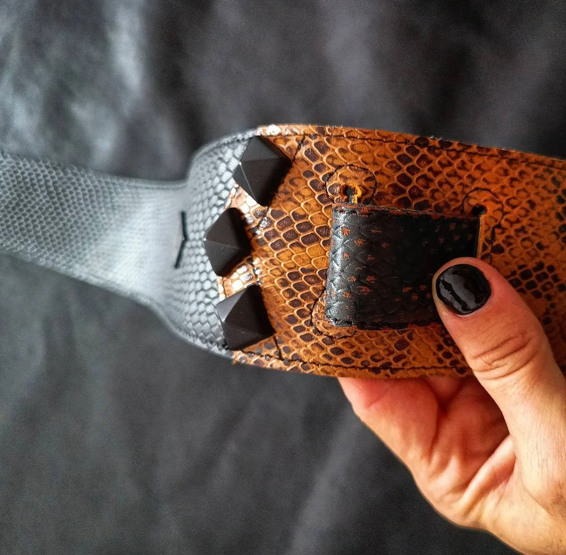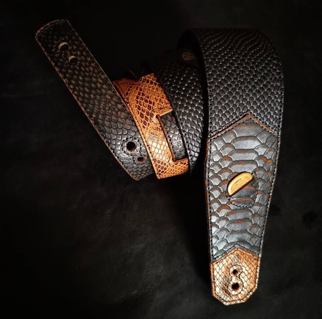 Una original combinación de cueros que dan por resultado, una correa única!. Sumamente flexible. Con porta pua