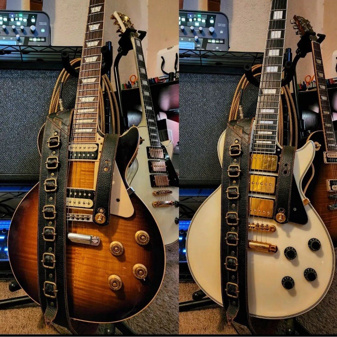 →Los orificios de cada extremo y ranuras desde donde regulas el largo de la correa, están cosidos por todos sus bordes para soportar perfectamente el peso de tu instrumento a través de los años!