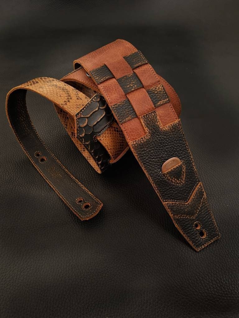 Cueros de diversas texturas entrelazados y combinados para generar un contraste sutil en esta espectacular correa para guitarra, con porta púas integrado que facilitara tus sesiones y shows. Fabricada con materiales de alta calidad y con atención meticulosa a los detalles.
