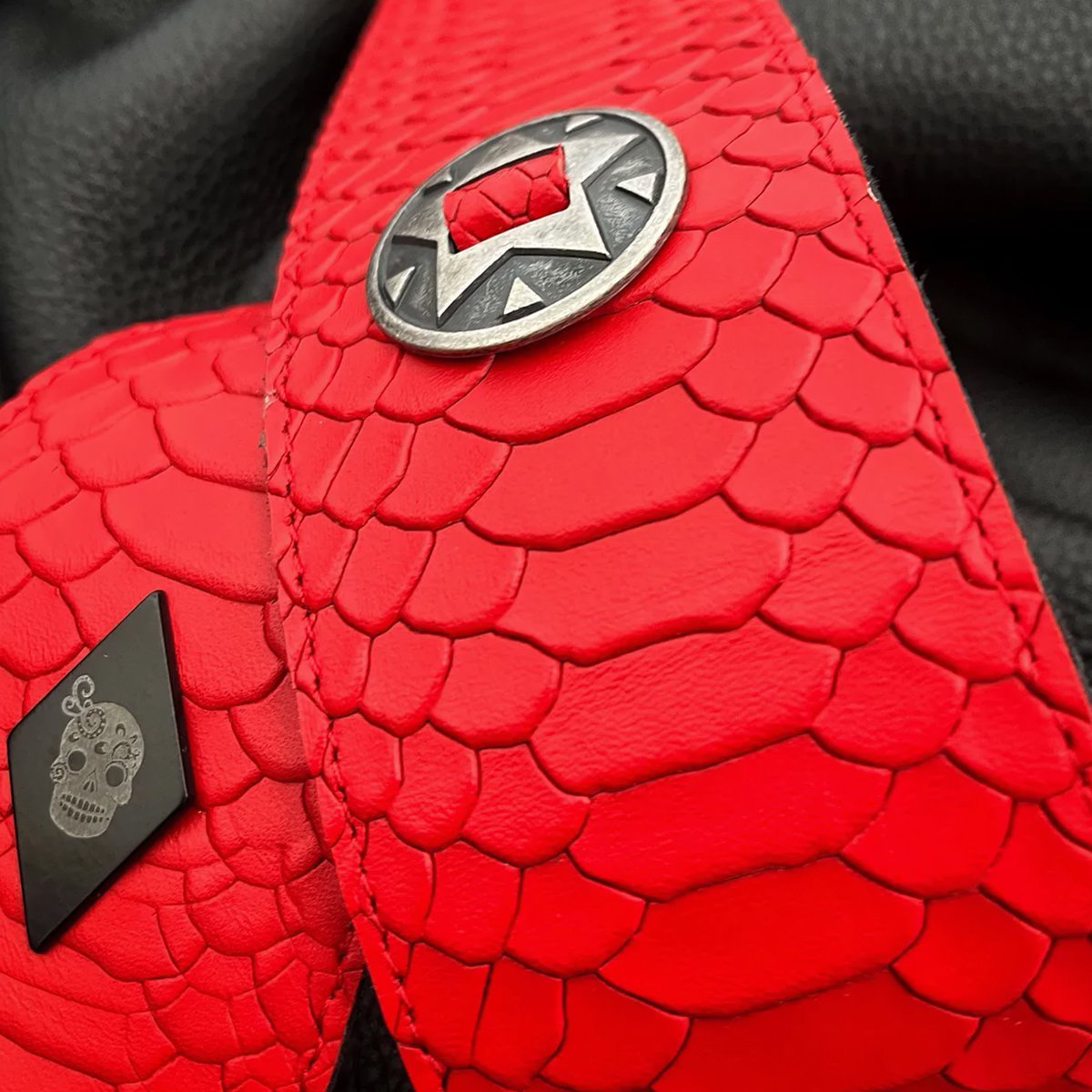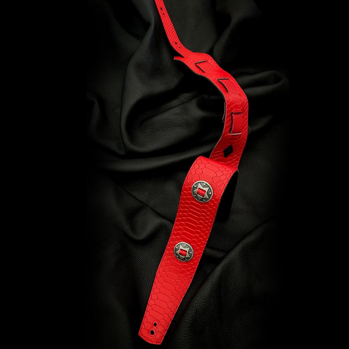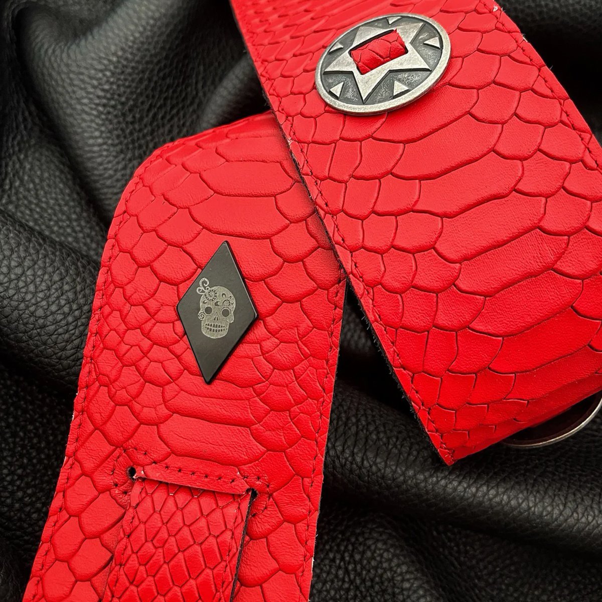 Textura de anaconda y una combinación de conchos metálicos originales de gran aspecto! Los conchos se extienden a lo largo de toda la correa, agregando un toque de estilo único y llamativo a tu imagen en el escenario. Fabricada con materiales de alta calidad y atención al detalle, esta correa no solo es elegante, sino también duradera y cómoda para tus actuaciones en vivo. ¡Haz que tu presencia en el escenario sea inolvidable con esta correa que roba miradas!
