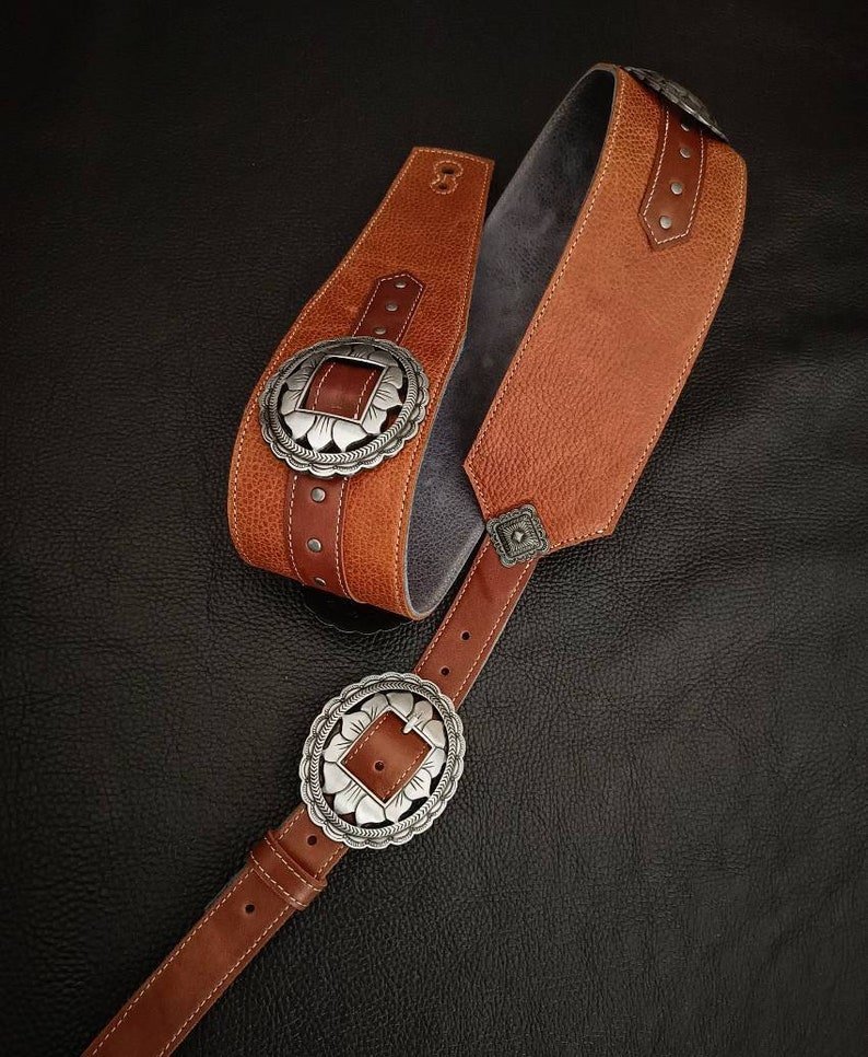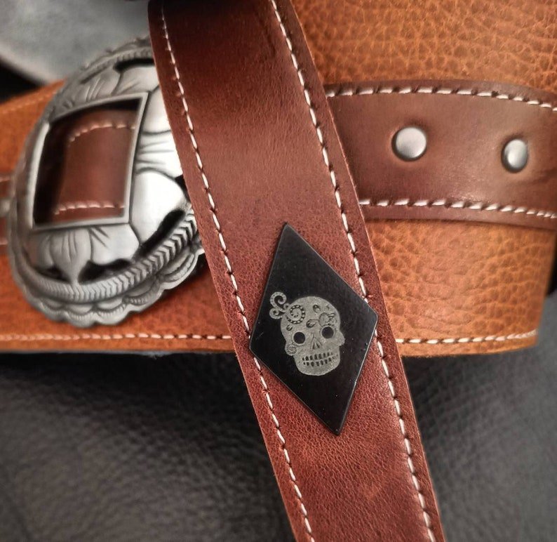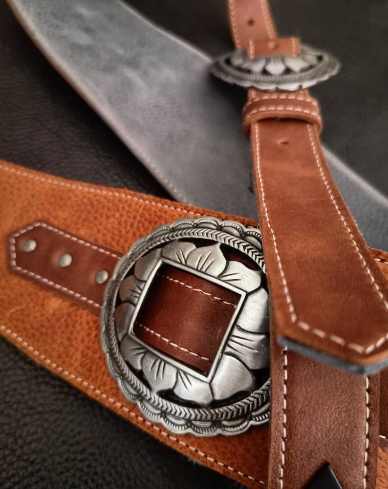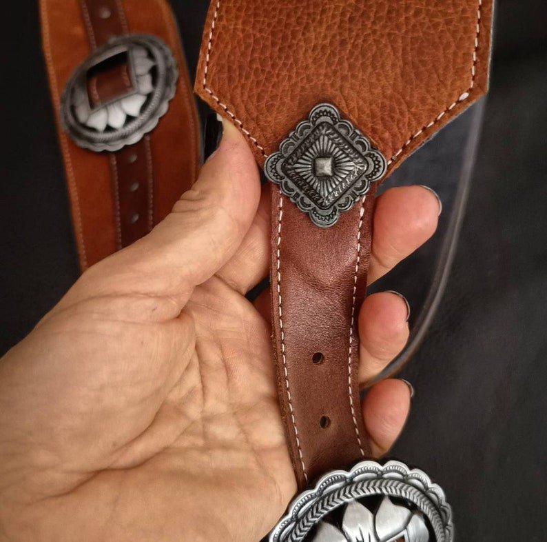 Una impresionante correa de cuero en tonos café, adornada con conchos labrados y equipada con un largo ajustable y hebilla, que no solo cumple, sino que supera todas tus expectativas en términos de confort y estilo para tus sesiones musicales. ¡Destaca en el escenario con elegancia y comodidad!