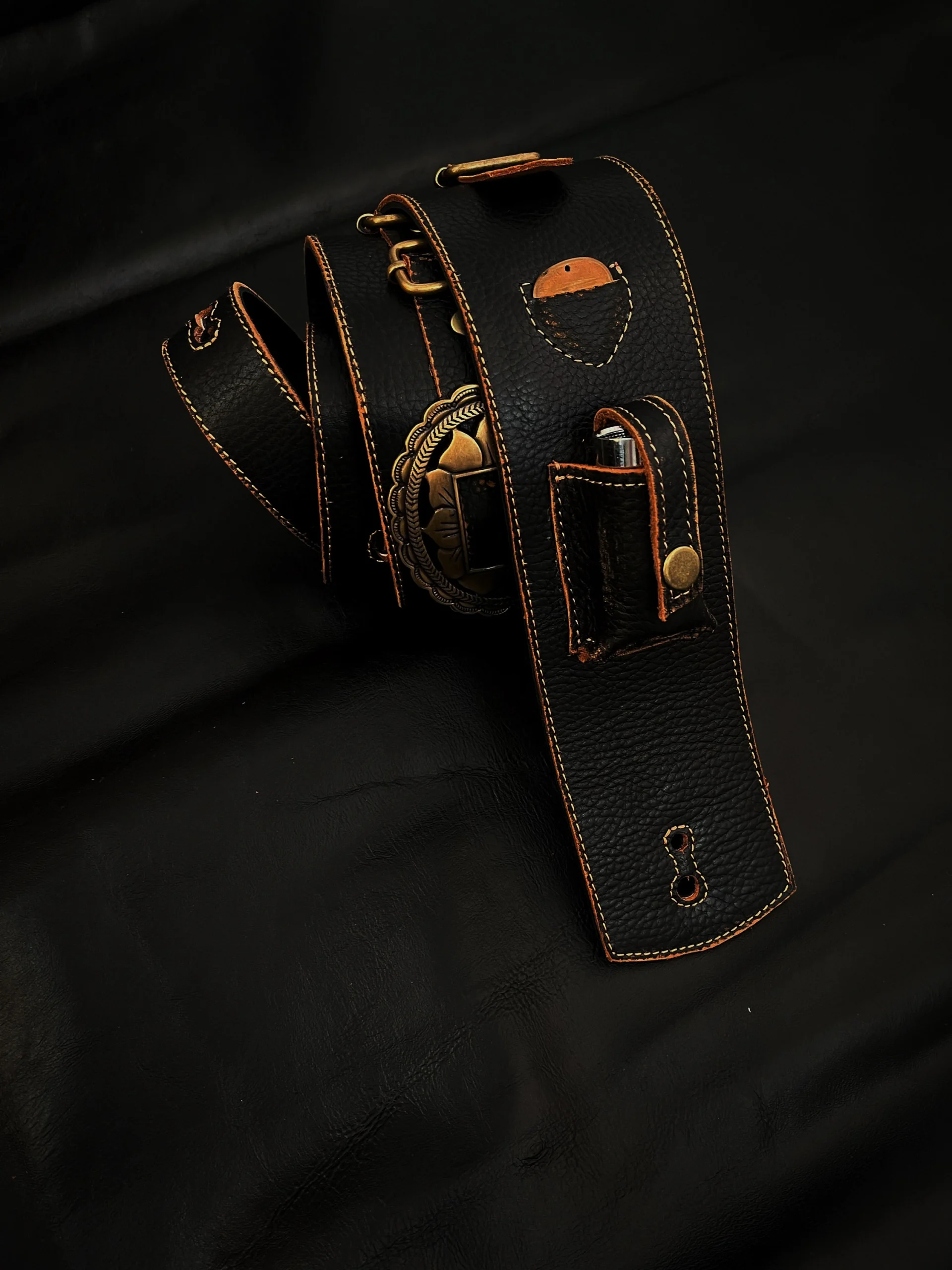 Se destaca por su notable flexibilidad y la belleza de sus conchos labrados, combinados con hebillas. Cuenta con un práctico bolsillo para el slide y porta púa.