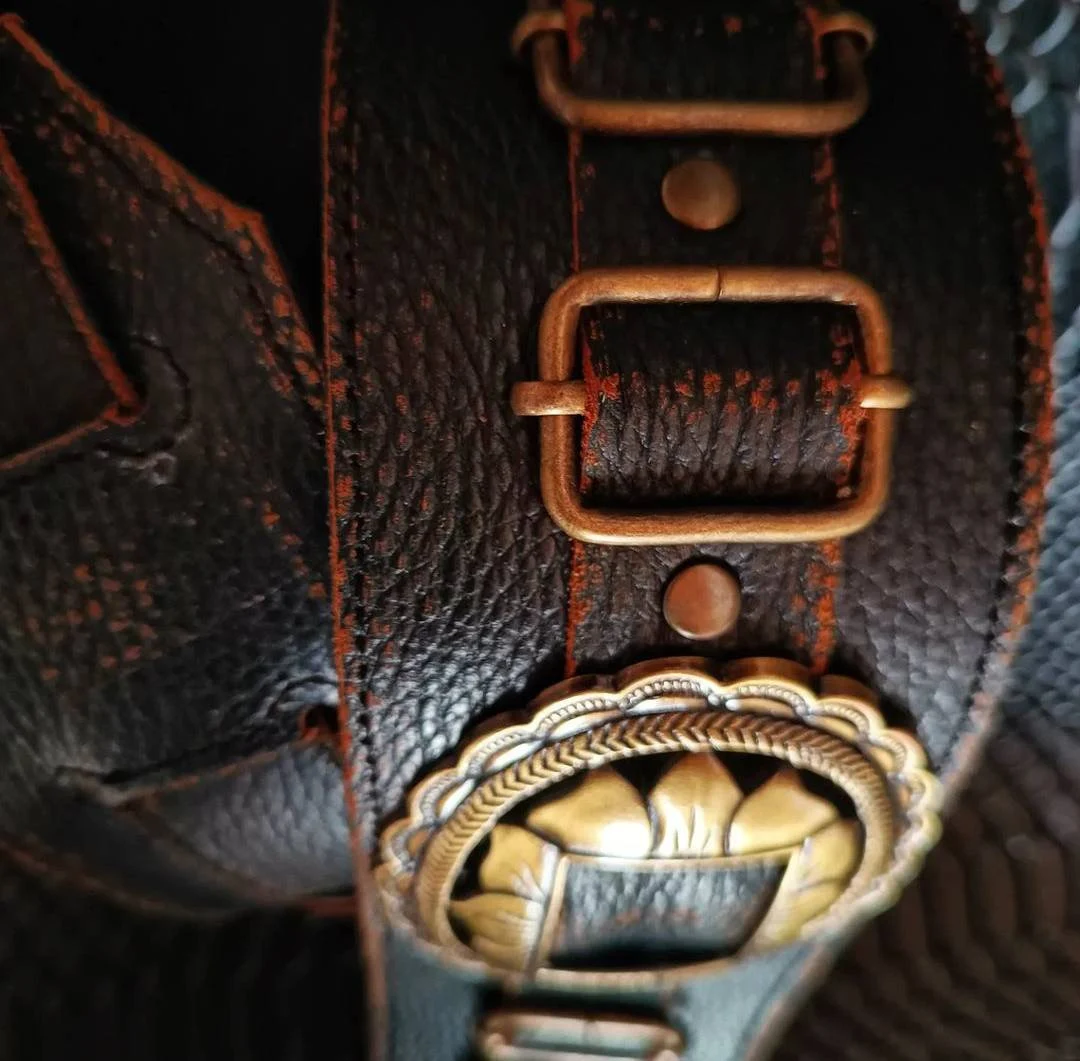 →Los orificios de cada extremo y ranuras desde donde regulas el largo de la correa, están cosidos por todos sus bordes para soportar perfectamente el peso de tu instrumento a través de los años!