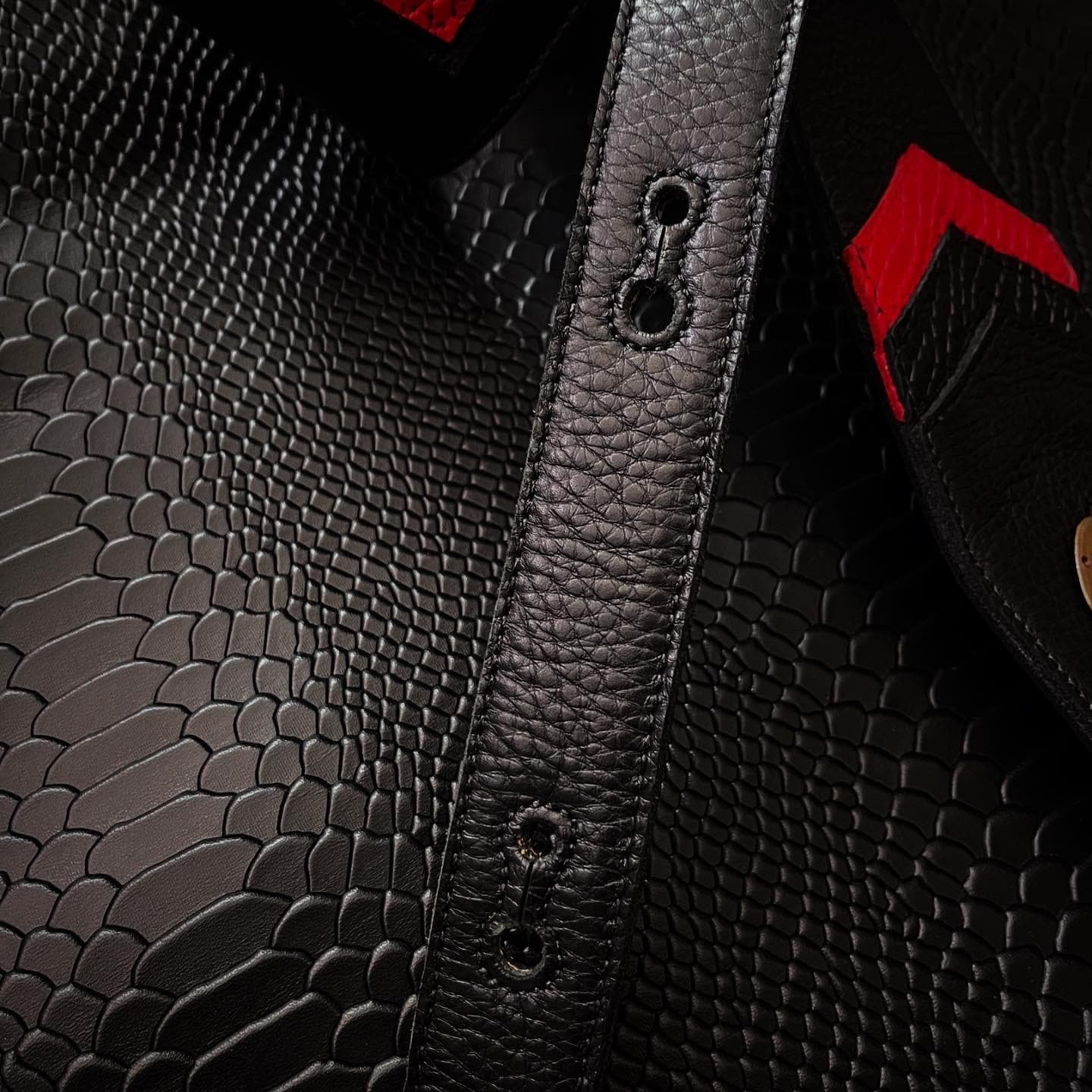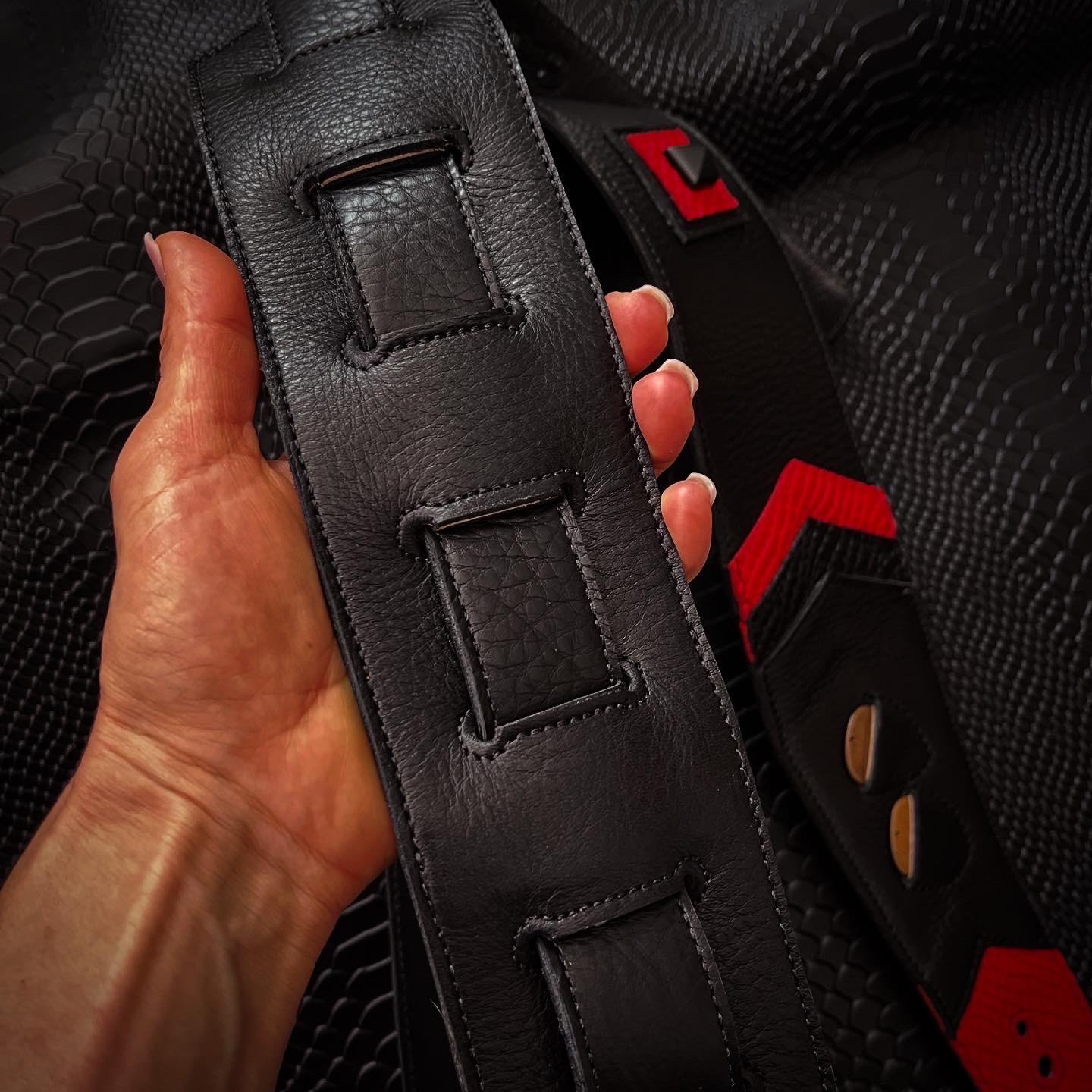 →Los orificios de cada extremo y ranuras desde donde regulas el largo de la correa, están cosidos por todos sus bordes para soportar perfectamente el peso de tu instrumento a través de los años!