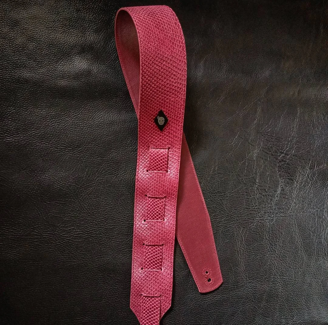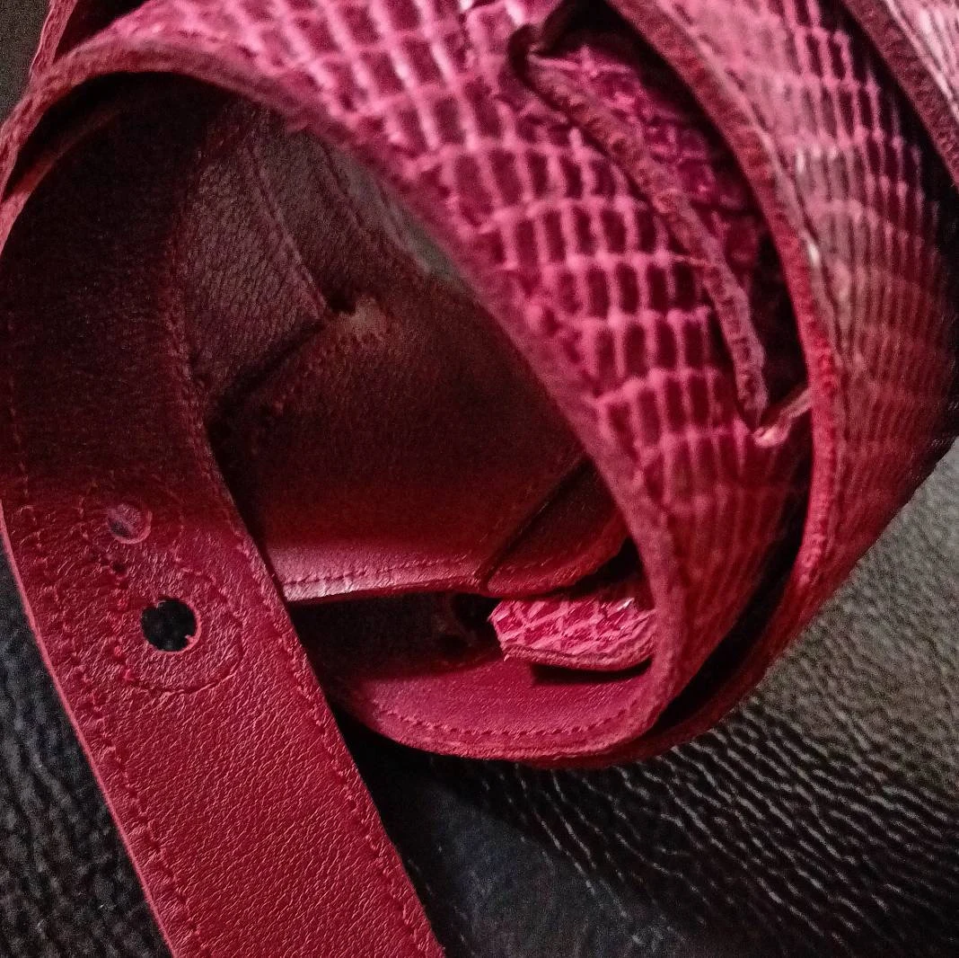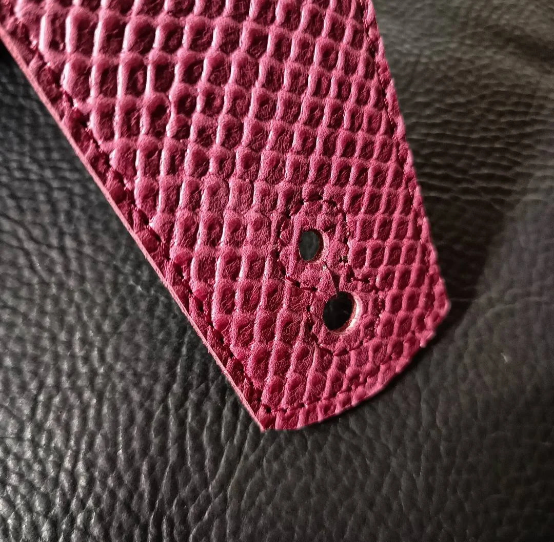 De lineas simples y clásicas. En cuero de textura víbora en vibrante color magenta