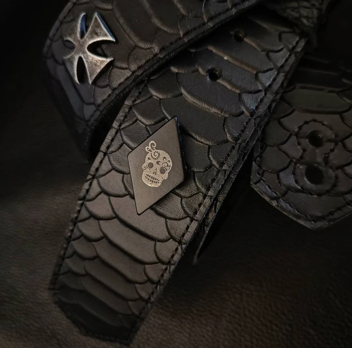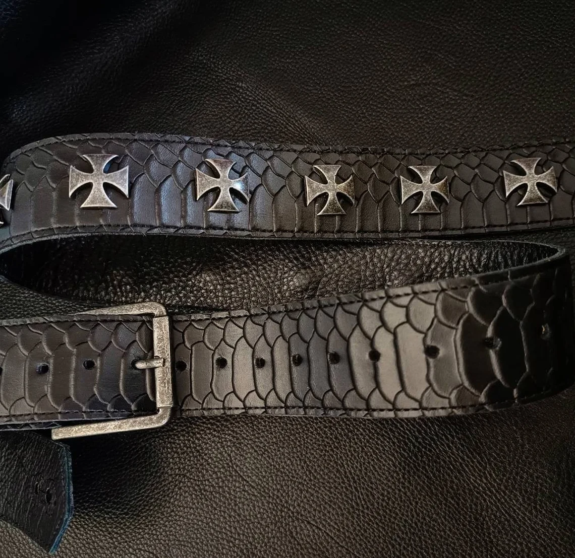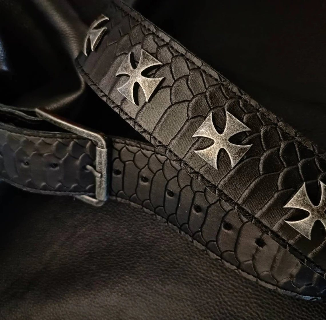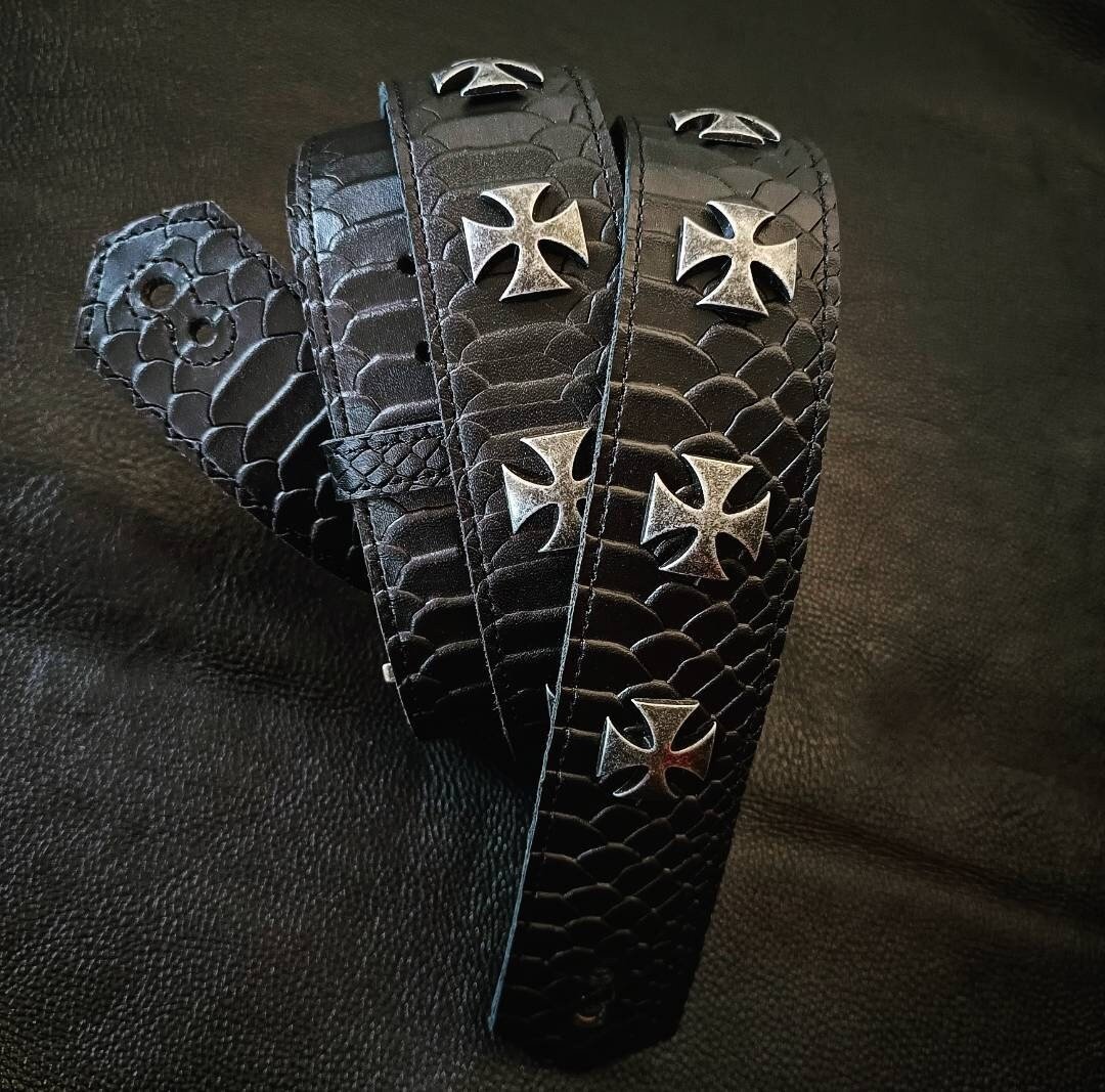 Una correa de gran impacto visual, textura anaconda con cruces de malta regulable con hebilla. Estilo Duff McKagan, Guns & Roses