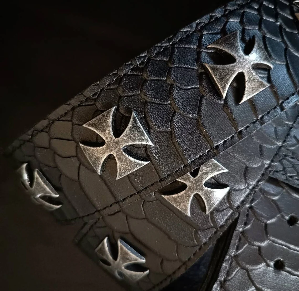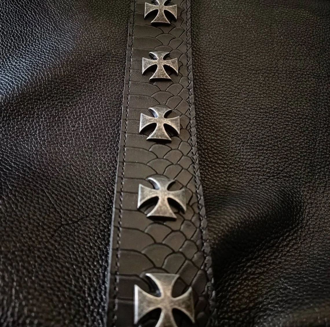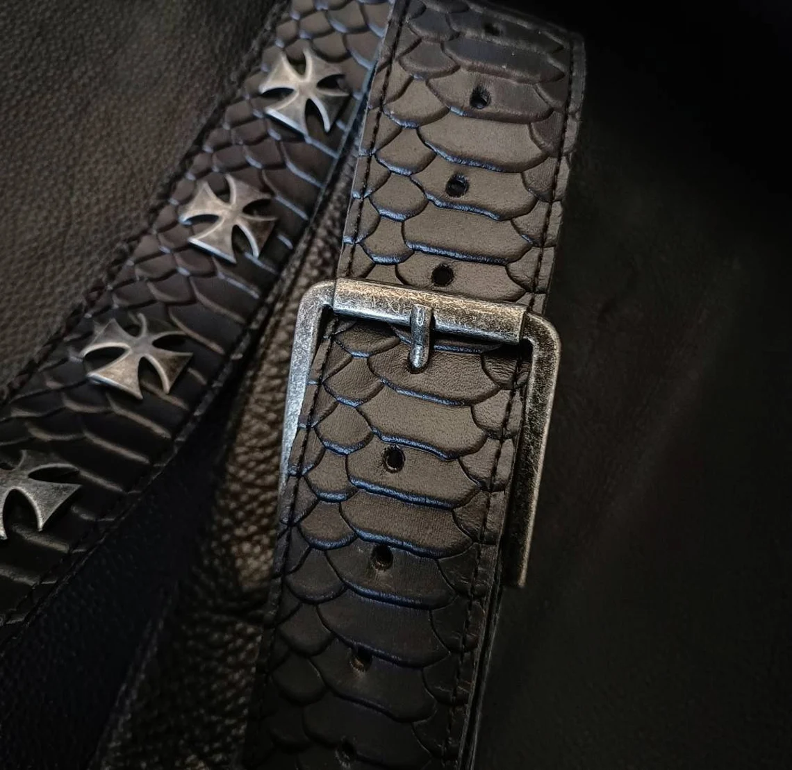 Una correa de gran impacto visual, textura anaconda con cruces de malta regulable con hebilla. Estilo Duff McKagan, Guns & Roses