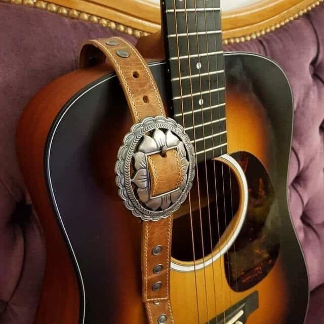 Hermosa correa para guitarra de estilo retro, con hebilla labrada y detalle de tachas