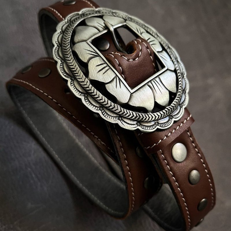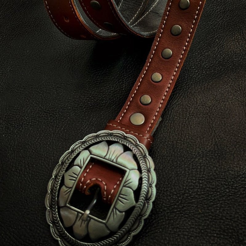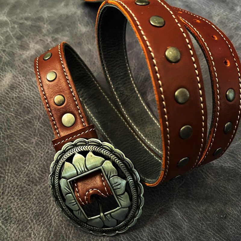 Hermoso cinturón con hebilla labrada y tachas. Confeccionado en cuero genuino de primera calidad. Confección artesanal.