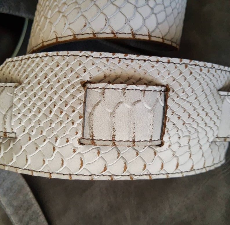 Hermosa correa de cuero con textura Anaconda efecto Relic. Decorada con cruces de malta. Super flexible!
