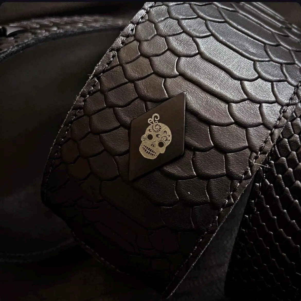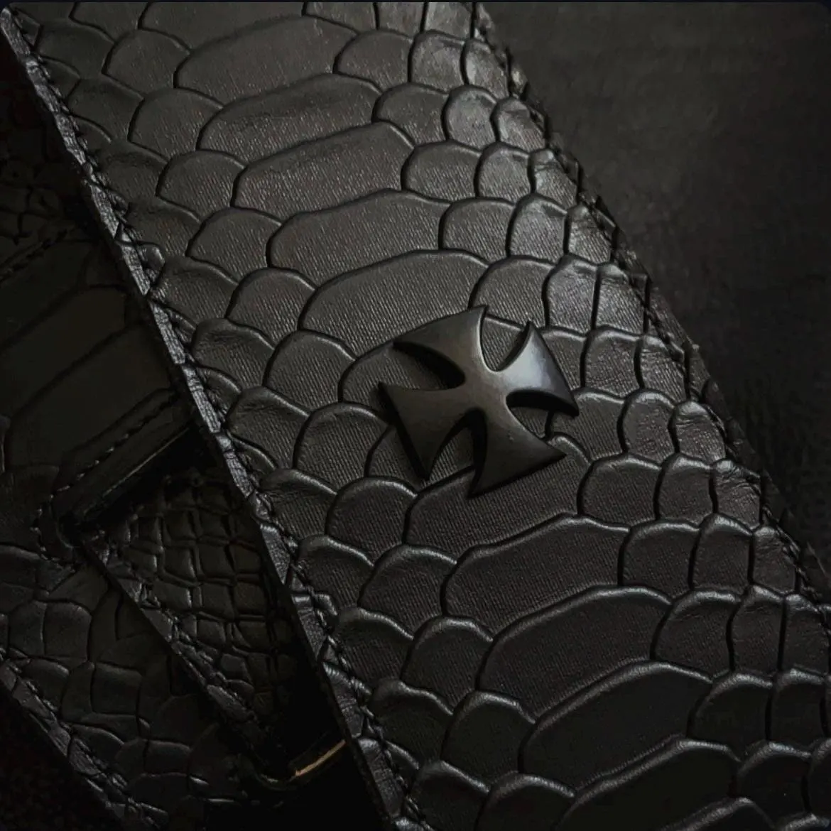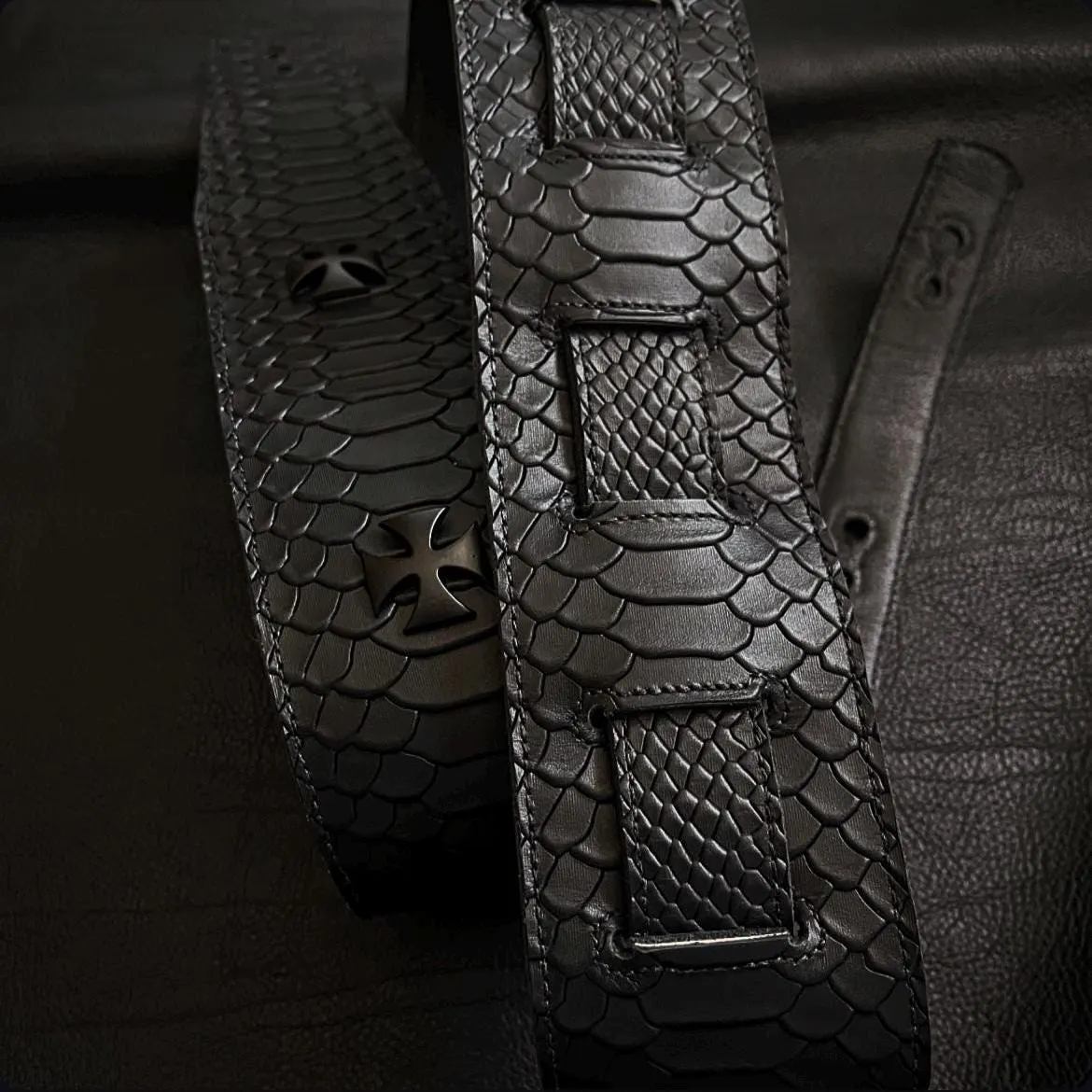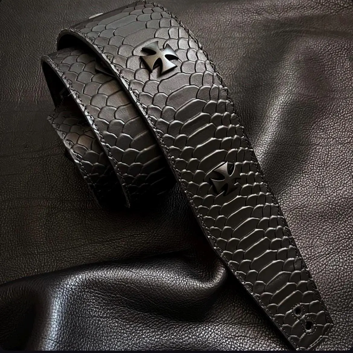 Esta correa combina la elegancia de la textura de Anaconda con el simbolismo de las cruces de malta, creando un look distintivo y lleno de carácter. Además de su atractivo visual, esta correa es super flexible, lo que te brinda comodidad y libertad de movimiento durante tus actuaciones en vivo. Fabricada con cuero de alta calidad, esta correa es duradera y resistente para soportar el ritmo de tu vida musical.